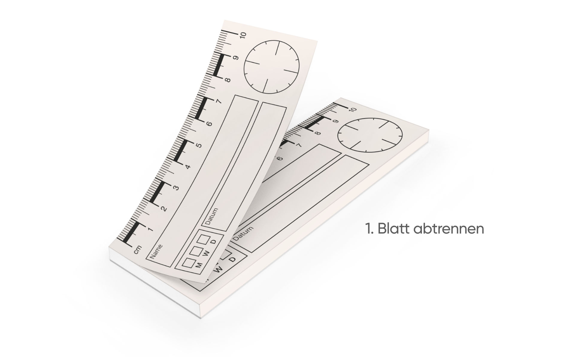 Vollständig selbstklebende Wundlineale zur wöchentlichen Dokumentation von Wunden. Alle freien Felder (wie Patientenname und Datum) ausfüllen und zusammen mit der zu behandelnden Wunde fotografieren. Dank des in beige eingefärbten Hintergrundes, läßt sich die Beschriftung auch bei stärkerem Foto-Lichtblitz problemlos ablesen. Einfache Archivierung dank Einzelblätter mit hoher Klebekraft. Einfach vom Block abtrennen, knicken, das untere Trägerpapier abziehen und auf den gewünschten Untergrund aufkleben.