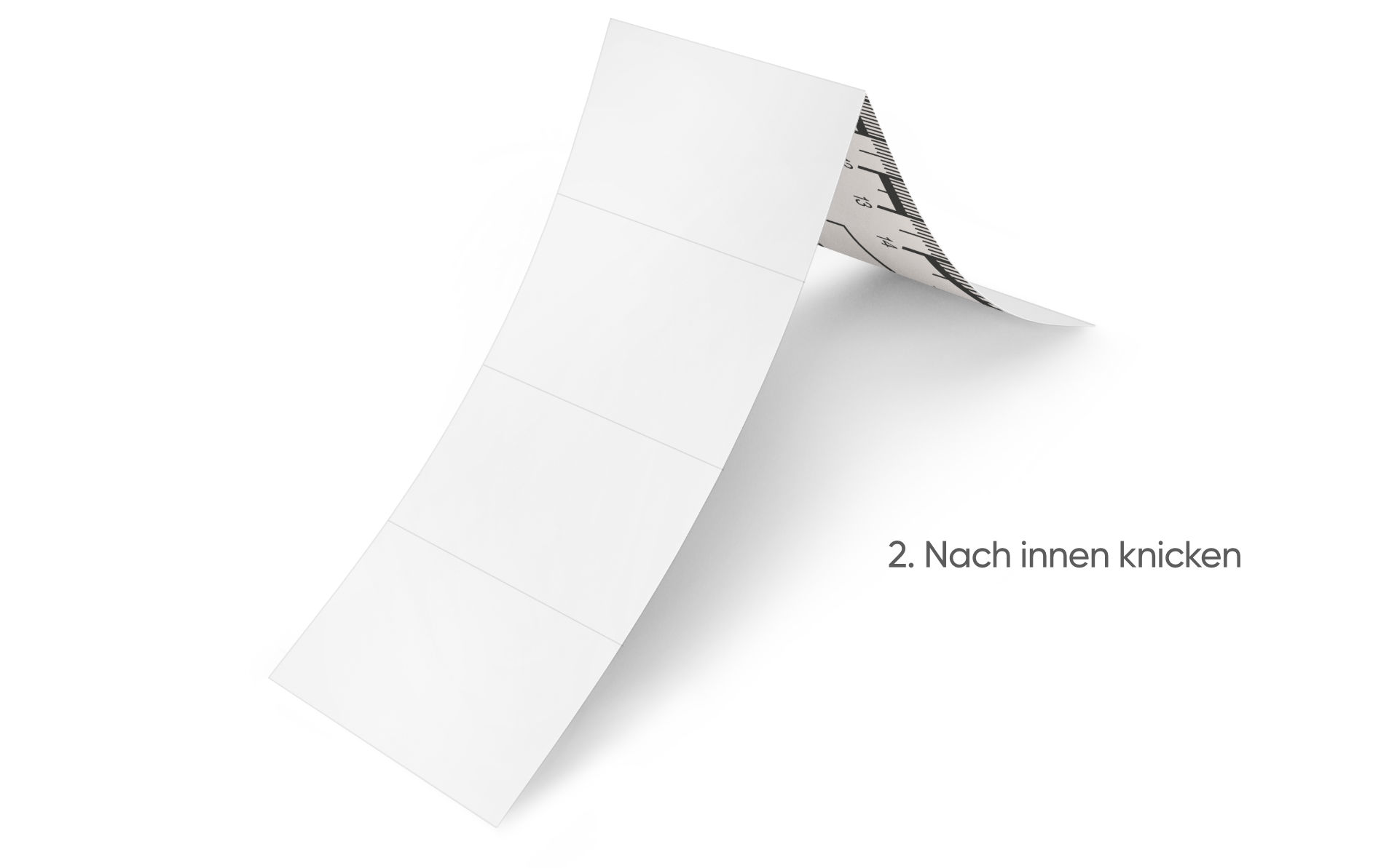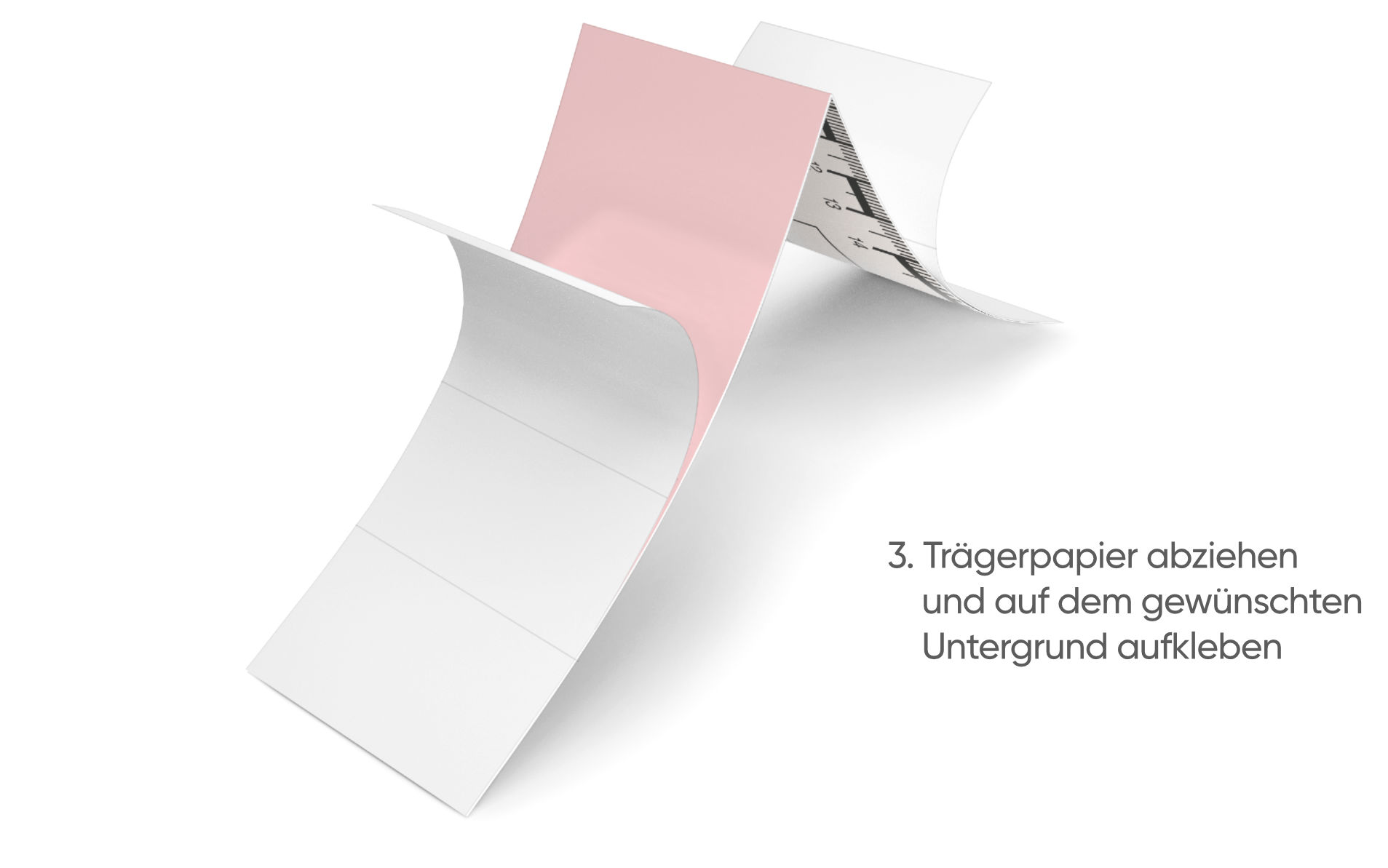 Blockformat 11 x 4cm, 25 Blatt per Block á 70µ Haftpapier weiß (gesamt 125 Blatt), auf der Rückseite ganzflächig haftend, geschlitztes Trägerpapier zum Knicken, grauer Bodenkarten an der schmalen Linksseite kopfgeleimt.