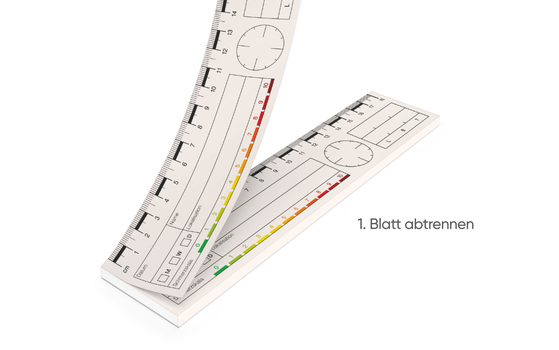 Vollständig selbstklebende Wundlineale zur wöchentlichen Dokumentation von Wunden. Alle freien Felder (wie Patientenname und Datum) ausfüllen und zusammen mit der zu behandelnden Wunde fotografieren. Dank des in beige eingefärbten Hintergrundes, läßt sich die Beschriftung auch bei stärkerem Foto-Lichtblitz problemlos ablesen. Einfache Archivierung dank Einzelblätter mit hoher Klebekraft. Einfach vom Block abtrennen, knicken, das untere Trägerpapier abziehen und auf den gewünschten Untergrund aufkleben.