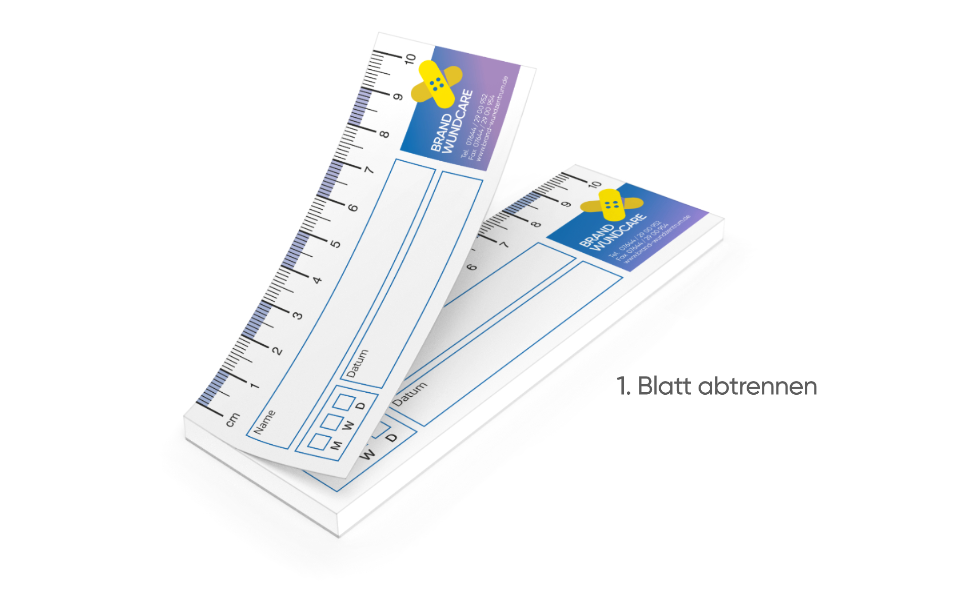 Individuell bedruckte Wundlineale mit geschlitztem Knick-Trägerpapier auf der Rückseite, darunter ganzflächig haftend mit hoher Klebekraft, an linker Schmalseite zu Blöcken geleimt.