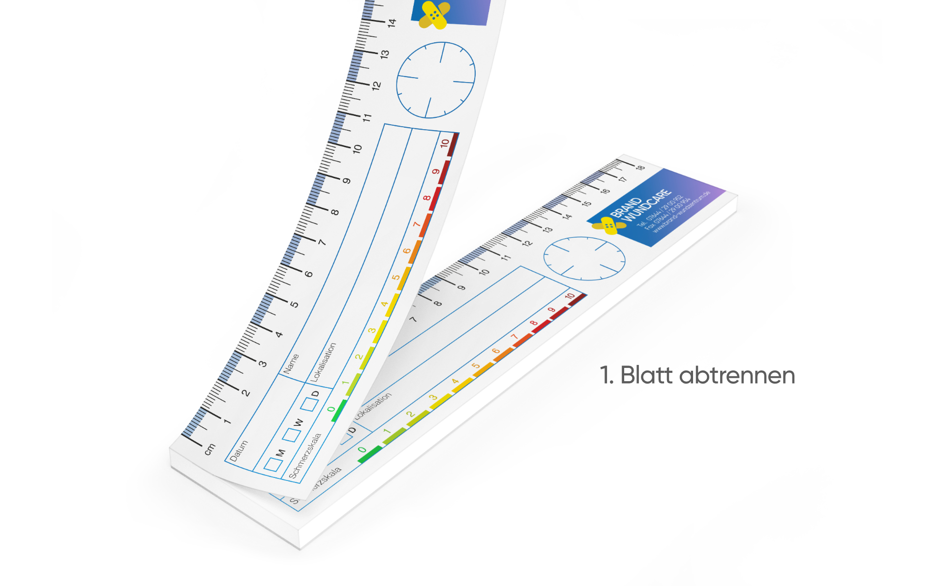 Die Gestaltung des Wundlineals, können entweder Sie selbst bzw. Ihre Werbeagentur/Grafiker_in vornehmen oder uns überlassen (das Letztere ist mit Aufpreis verbunden – siehe Auswahlmöglichkeiten bei Druckvorlage). Spezifikationen wie Felder (Name, Geschlecht, Schmerzskala etc.) können frei nach Ihren Wünschen vorgenommen werden.