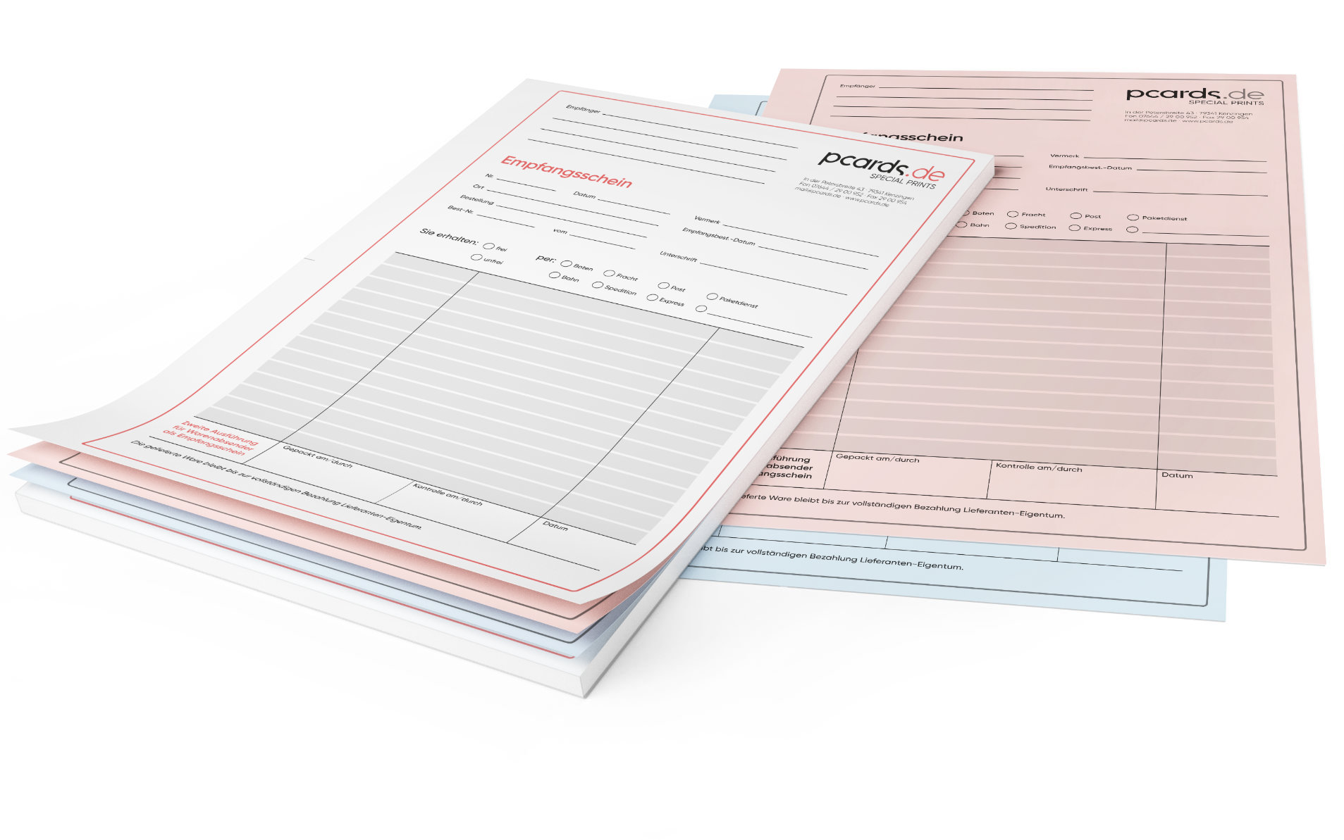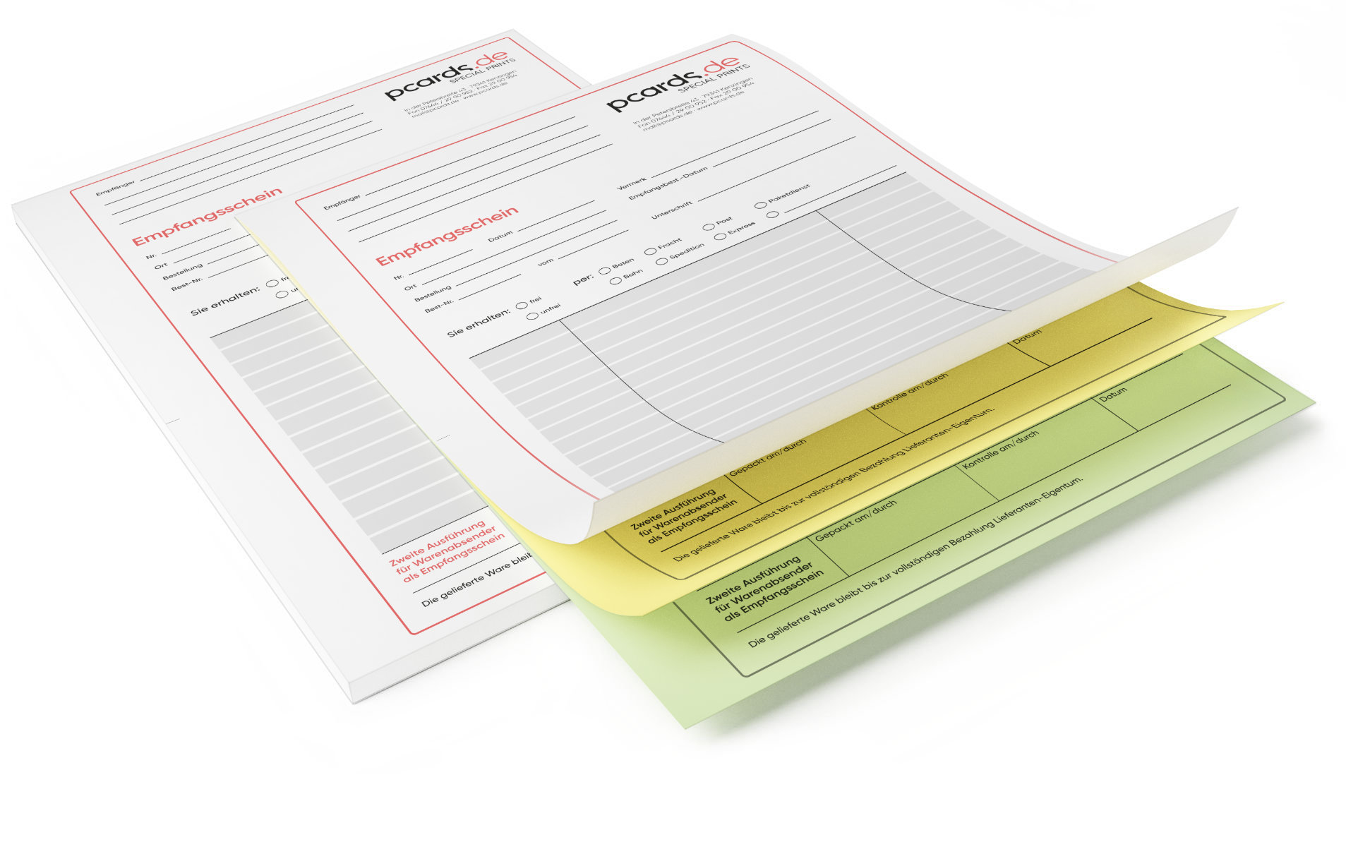 Mit Ihrem Firmenlogo und Kontaktdaten bedruckte Empfangsschein-Bücher, bestehend aus 2-3 fach Durchschreibesätzen – mit je 25 oder 50 Sätzen pro Block. Das Oberblatt ist jeweils weiß und kann in jeder beliebigen Firmenfarbe bedruckt werden (4C Druck), die 1-2 darauf folgenden "Kopie"-Seiten (Mittel-/Unterblatt) können nach Belieben aus 5 Farbtönen gewählt werden und werden 1-farbig in SW bedruckt.