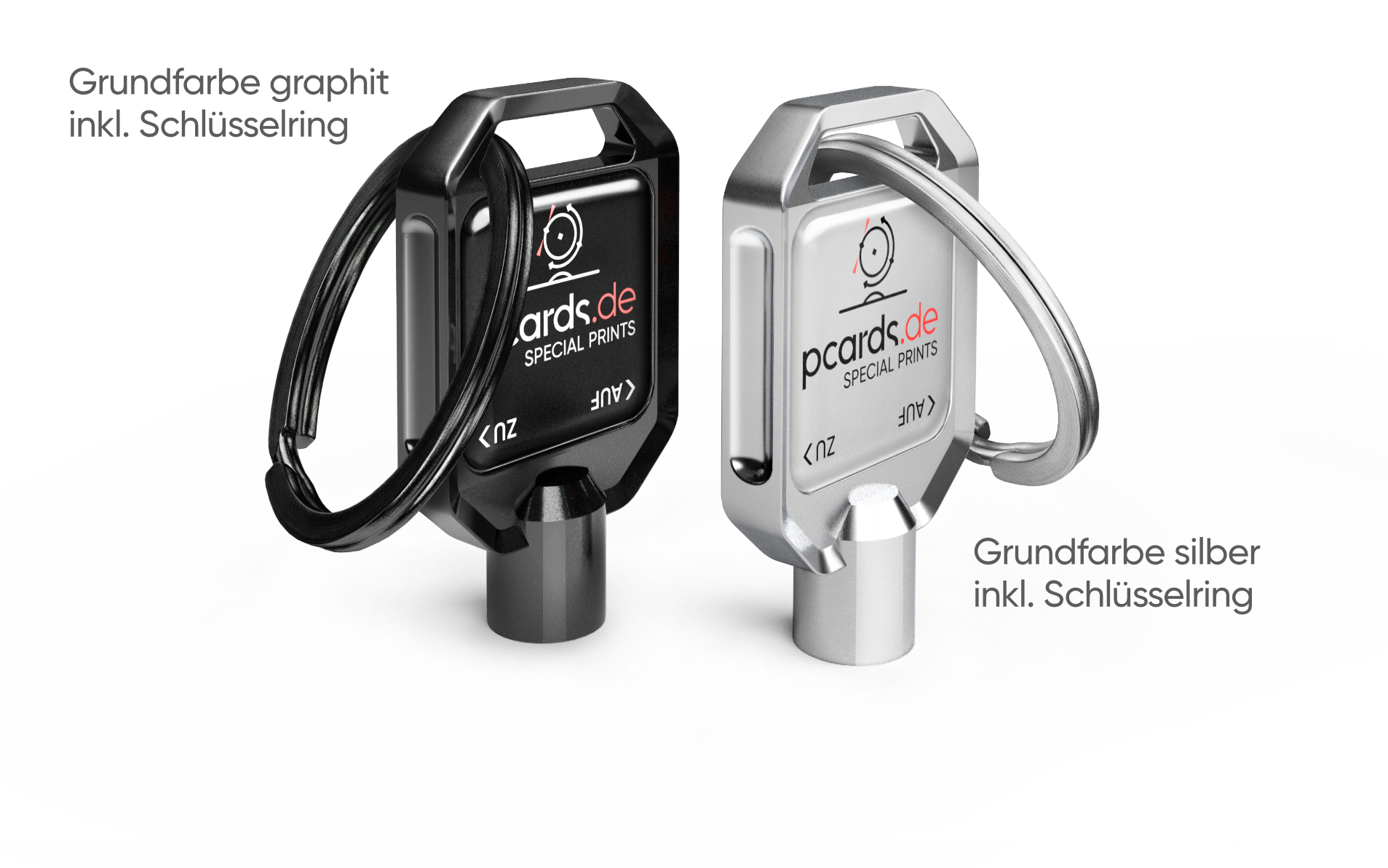 Stillvoller Schlüsselanhänger mit Heizkörper-Entlüftungsfunktion und 2-seitiger Werbemöglichkeit. Lieferbar in silber (verchromt) oder graphit (dunkelgrau metallic). Komplett mit farblich passendem Schlüsselring in dekorativer Verpackung. Optional läßt sich auch die Verpackung individuell an das Kunden-Design anpassen. Ab 500 Stück läßt sich der Schlüsselanhänger im gewünschten Kundenfarbton einfärben (Metalliclack). Dieser Artikel ist exclusiv nur bei uns erhältlich.
