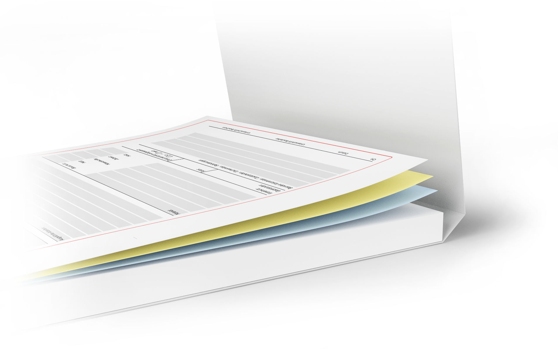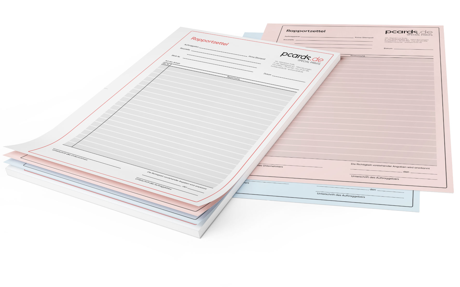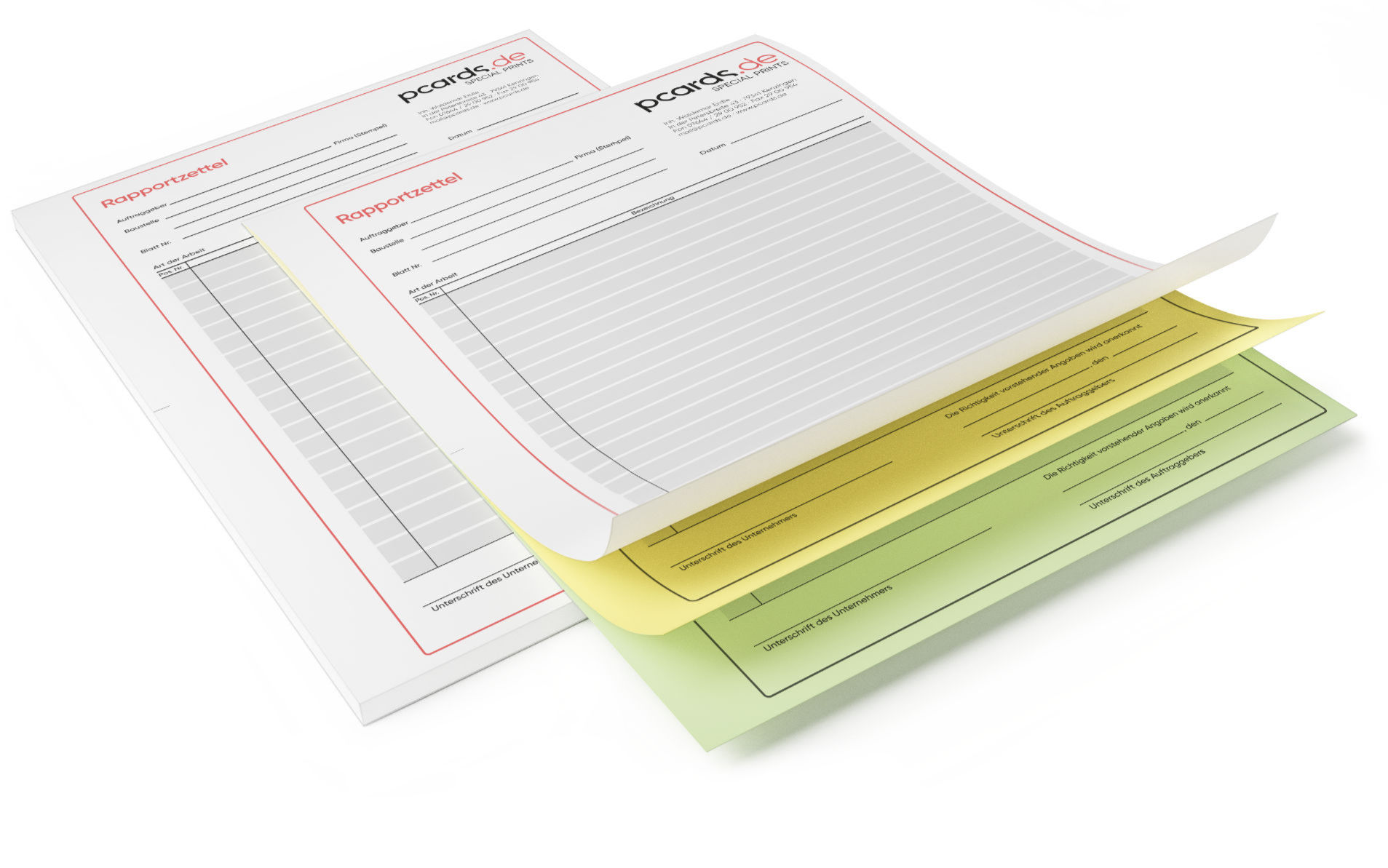 Mit Ihrem Firmenlogo und Kontaktdaten bedruckte Rapportblocks, bestehend aus 2-3 fach Durchschreibesätzen – mit je 25 oder 50 Sätzen pro Block. Das Oberblatt ist jeweils weiß und kann in jeder beliebigen Firmenfarbe bedruckt werden (4C Druck), die 1-2 darauf folgenden "Kopie"-Seiten (Mittel-/Unterblatt) können nach Belieben aus 5 Farbtönen gewählt werden und werden 1-farbig in SW bedruckt.
