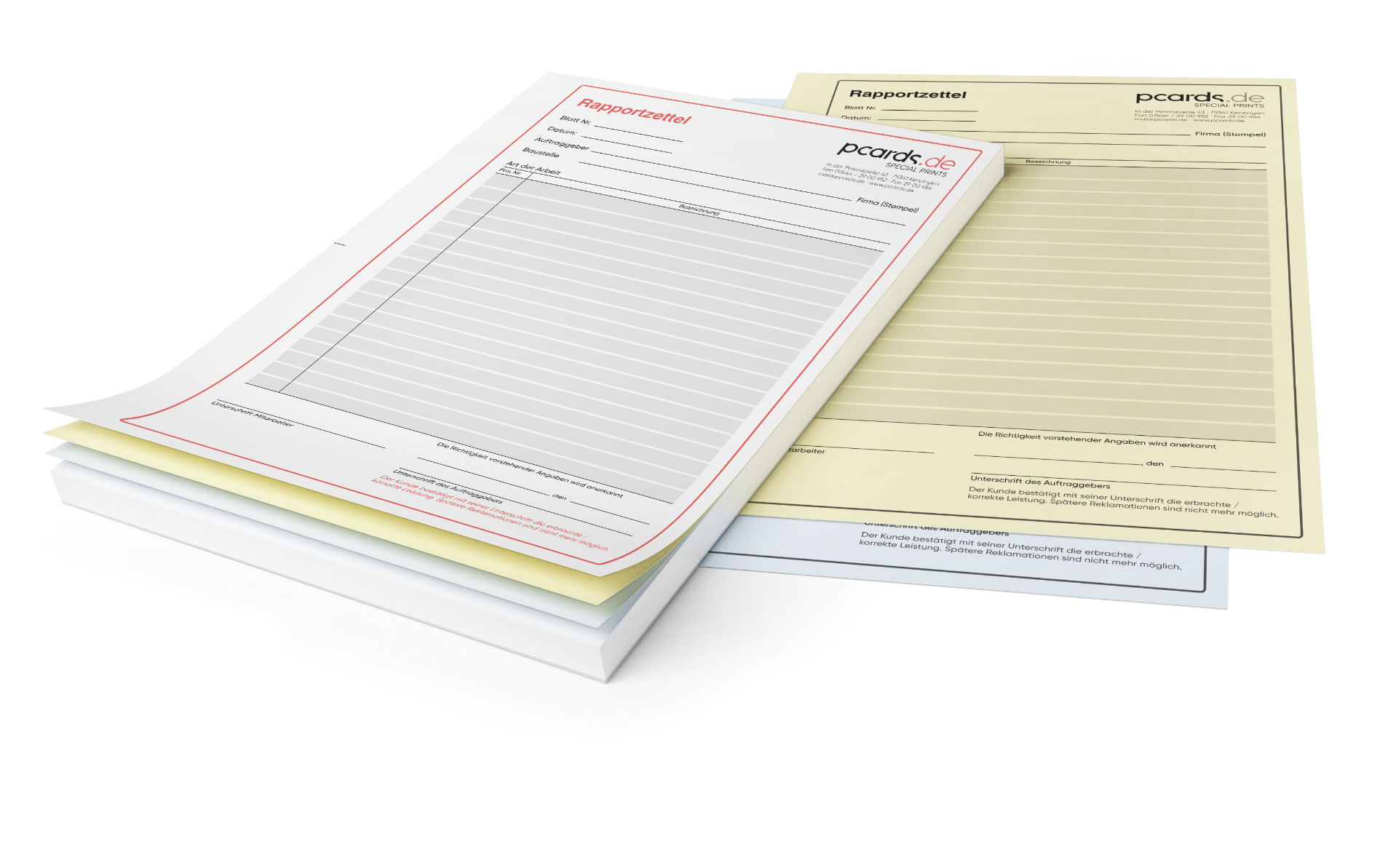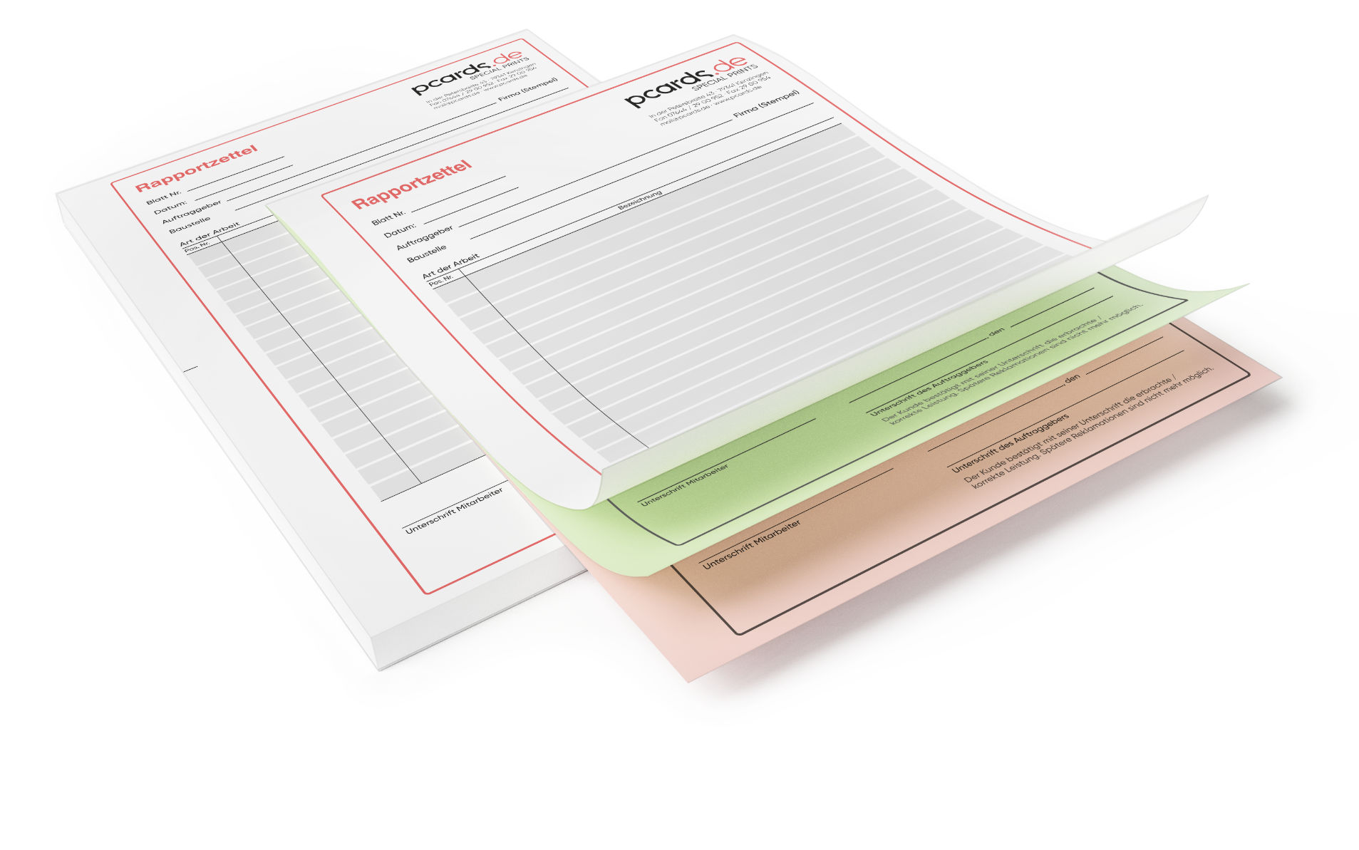 Mit Ihrem Firmenlogo und Kontaktdaten bedruckte Rapportblocks, bestehend aus 2-3 fach Durchschreibesätzen – mit je 25 oder 50 Sätzen pro Block. Das Oberblatt ist jeweils weiß und kann in jeder beliebigen Firmenfarbe bedruckt werden (4C Druck), die 1-2 darauf folgenden "Kopie"-Seiten (Mittel-/Unterblatt) können nach Belieben aus 5 Farbtönen gewählt werden und werden 1-farbig in SW bedruckt.